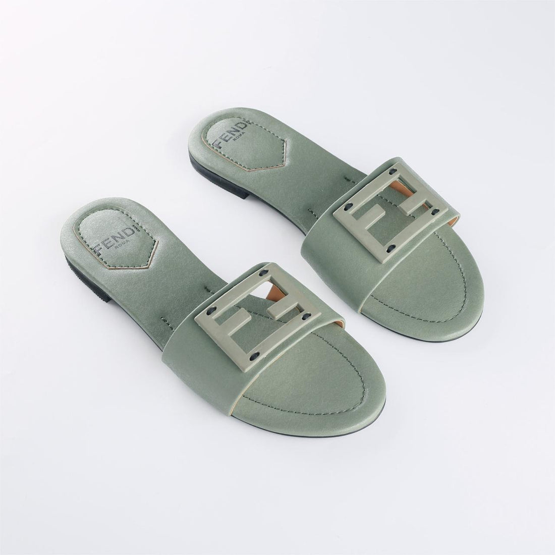 Fendi Women's Baguette Leather Slides. These Green leather slides feature a wide front strap with...