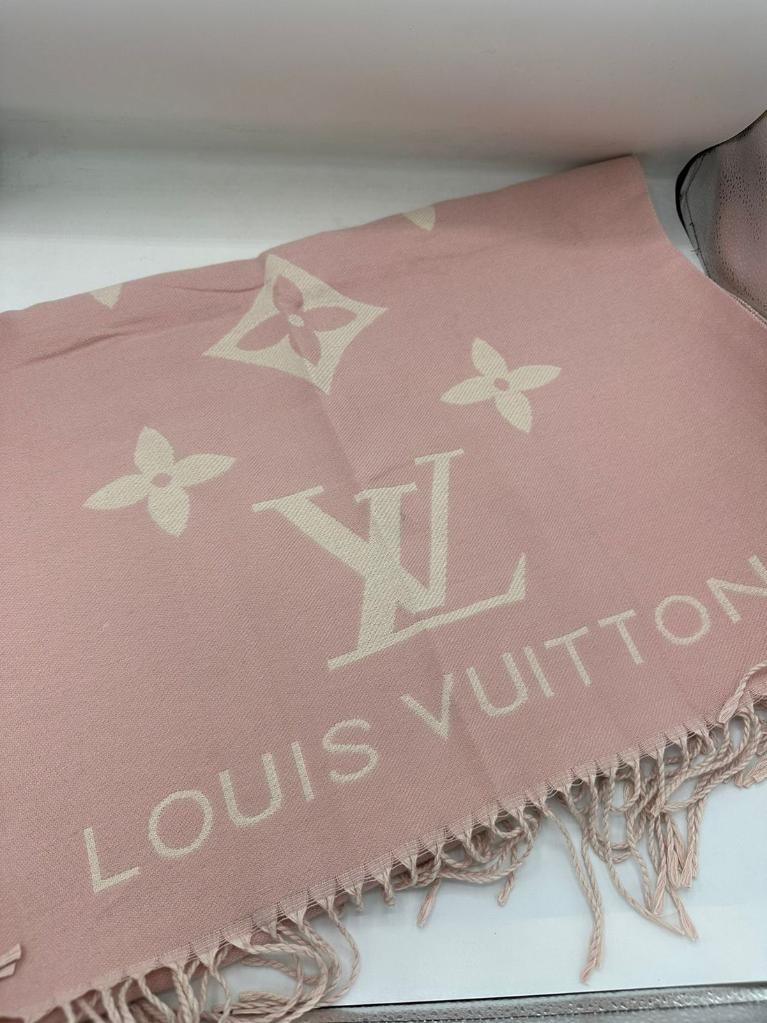 LV pink scarf with the brand's iconic monogram pattern in off-white. The words "LOUIS VUITTON" are...