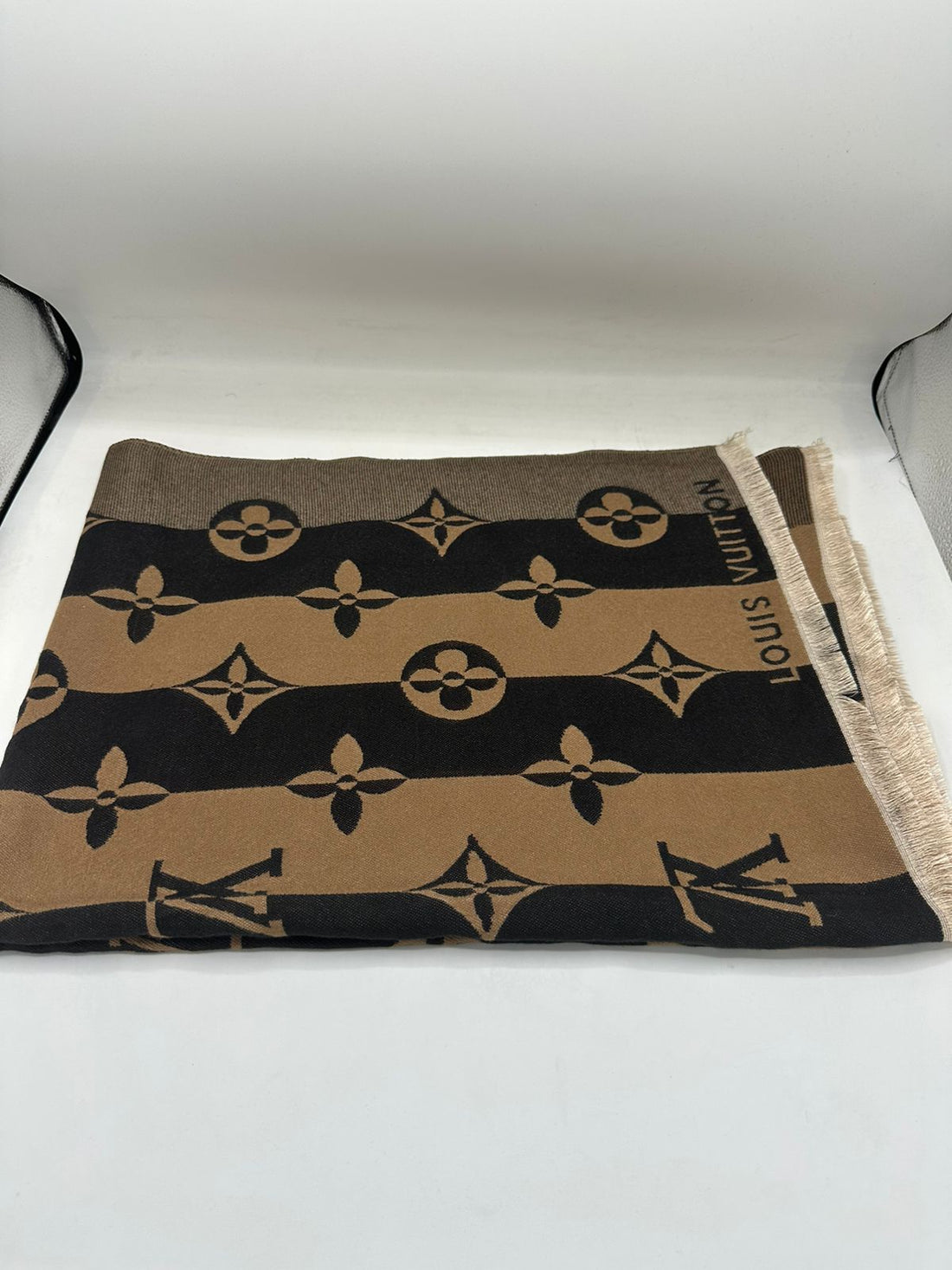 LV Women's Cashmere Shawl, featuring the brand's iconic LV monogram design in brown and black....