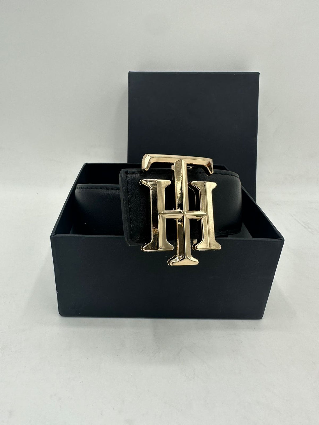 Tommy Hilfiger black leather belt featuring a gold-toned "TH" logo buckle, presented in a black...