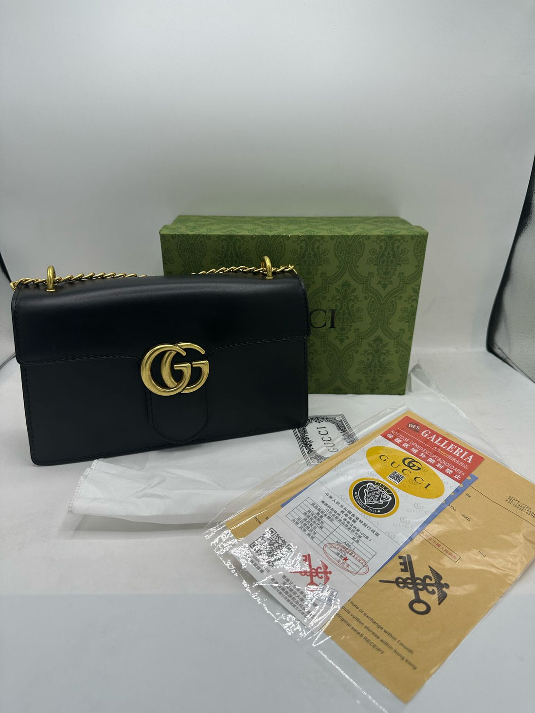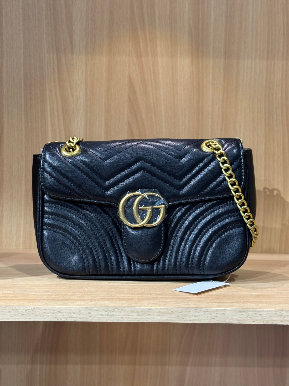 Gucci GG Marmont leather shoulder bag with a gold chain strap and the signature 'GG'...