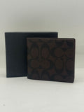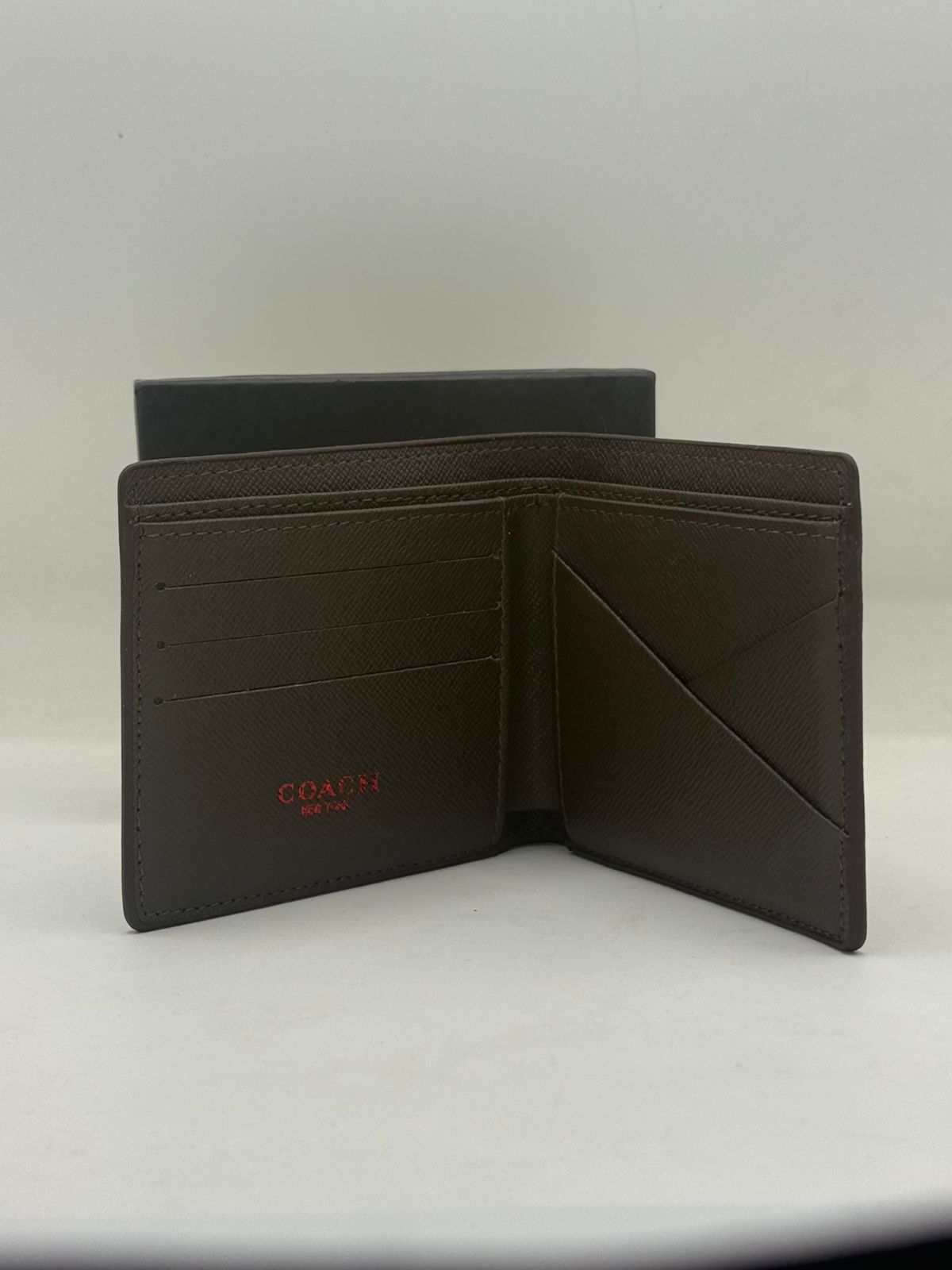 men's bifold wallet from the brand Coach, presented in a black gift box.
