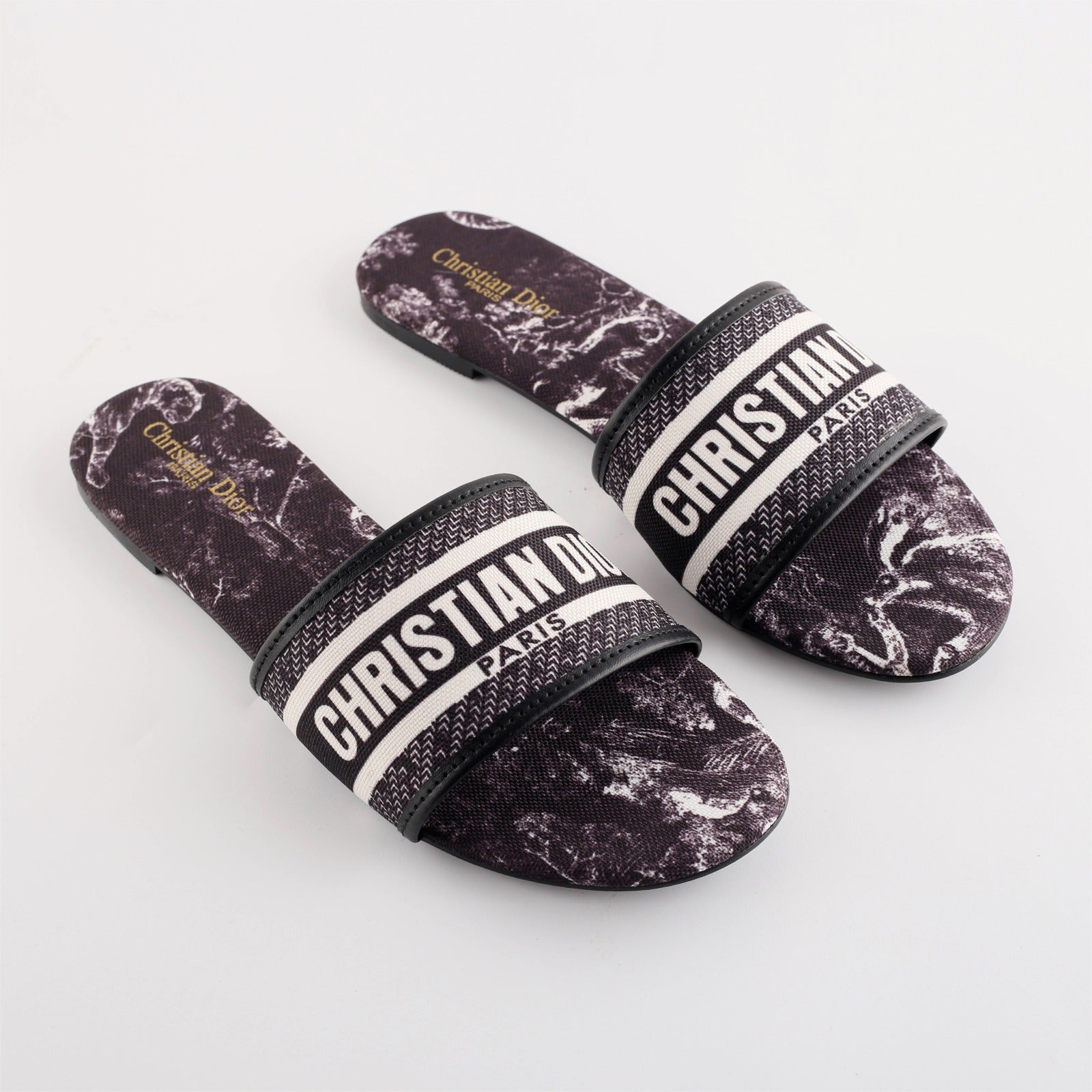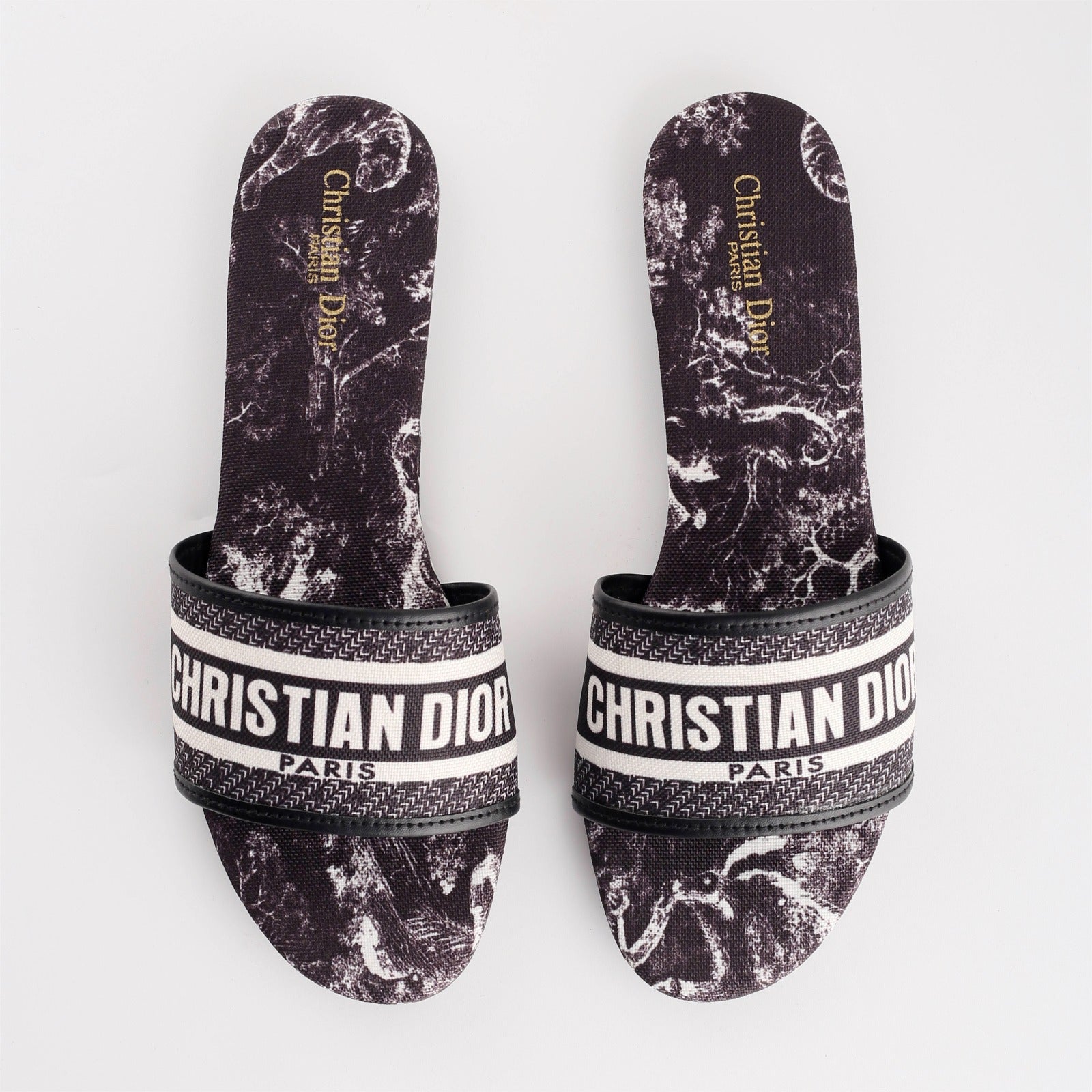 The Dway slide is a hallmark and timeless style honoring the House's Toile de Jouy motif. The vibrant blue upper has an embroidered Christian Dior Paris signature for an instantly recognizable touch. Its streamlined silhouette makes it easy to slip on to complete a relaxed look. The shoe will pair well with other Toile de Jouy creations from the collection.