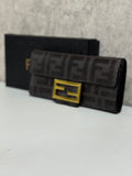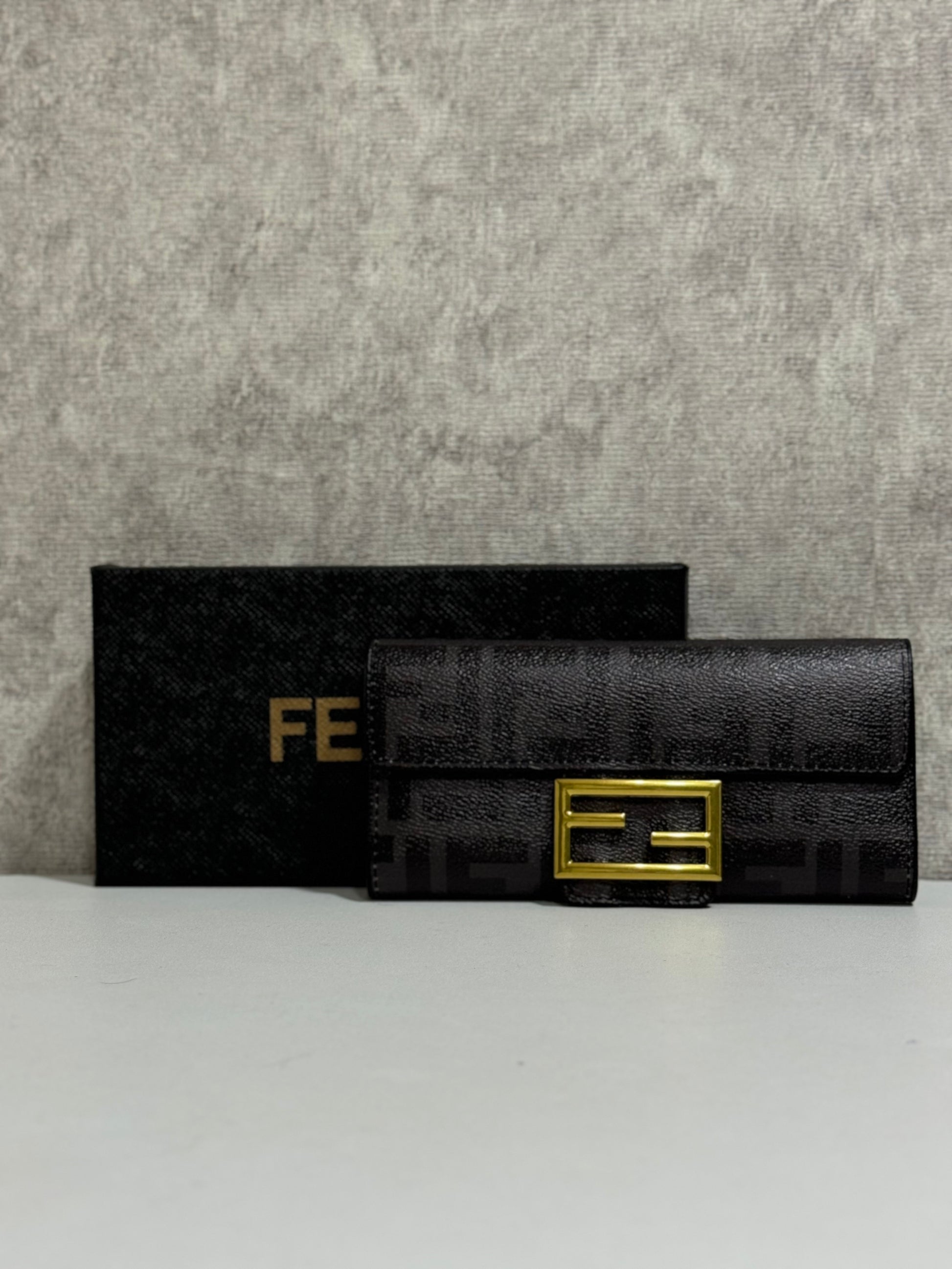 Fendi Baguette wallet on a chain, featuring the iconic FF logo and a detachable strap for versatile wear. It is made of jacquard fabric with leather details and gold-finish metal ware. The wallet has a flap with an FF clasp, an interior compartment with six card slots, and can be carried as a clutch, under the arm, or cross-body. The bag's dimensions are approximately 11.5 cm in height, 21 cm in width, and 5 cm in depth. The strap length is adjustable, with a minimum of 82 cm.