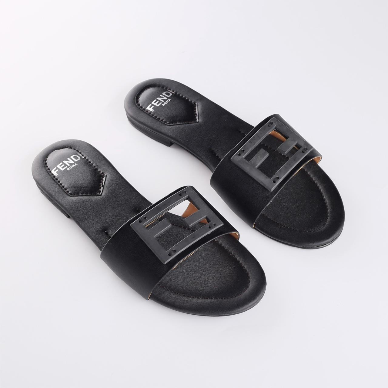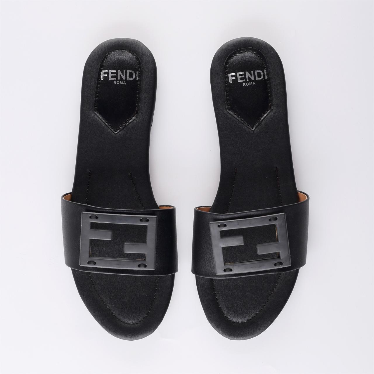 Fendi Women's Baguette Leather Slides. These black leather slides feature a wide front strap with a cut-out "F" logo and a gold "FENDI ROMA" logo on the insole. The slides have a flat, thin leather sole and an open-toe design. They are made in Italy from high-quality leather.