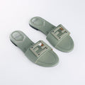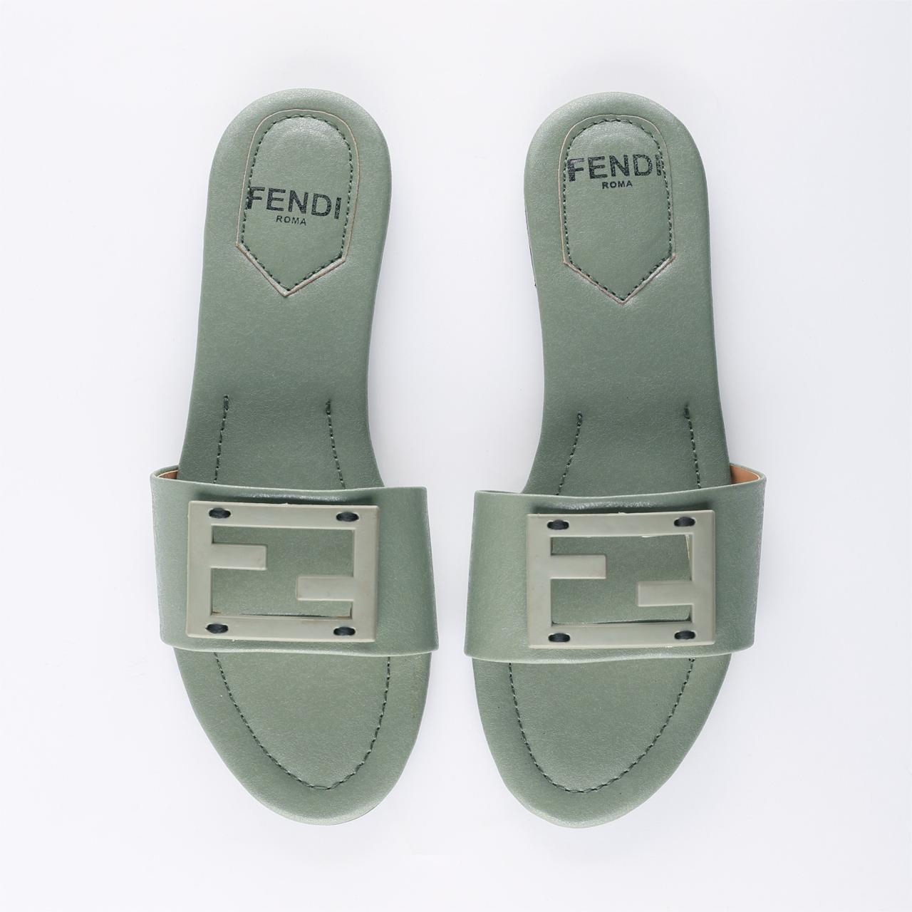 Fendi Women's Baguette Leather Slides. These Green leather slides feature a wide front strap with a cut-out "F" logo and a gold "FENDI ROMA" logo on the insole. The slides have a flat, thin leather sole and an open-toe design. They are made in Italy from high-quality leather.