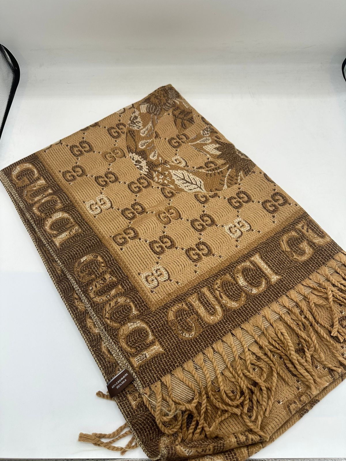 GG Check Fur scarf, likely made of cashmere. The scarf features a repeating "GG" pattern and the word "GUCCI" along its edges, finished with fringed ends. Original Gucci scarves are manufactured in Italy and often have hand-rolled borders or hand-stitched edges. The colour of the scarf in the image appears to be a tan or beige tone with darker brown accents for the logos and patterns.