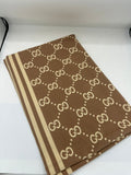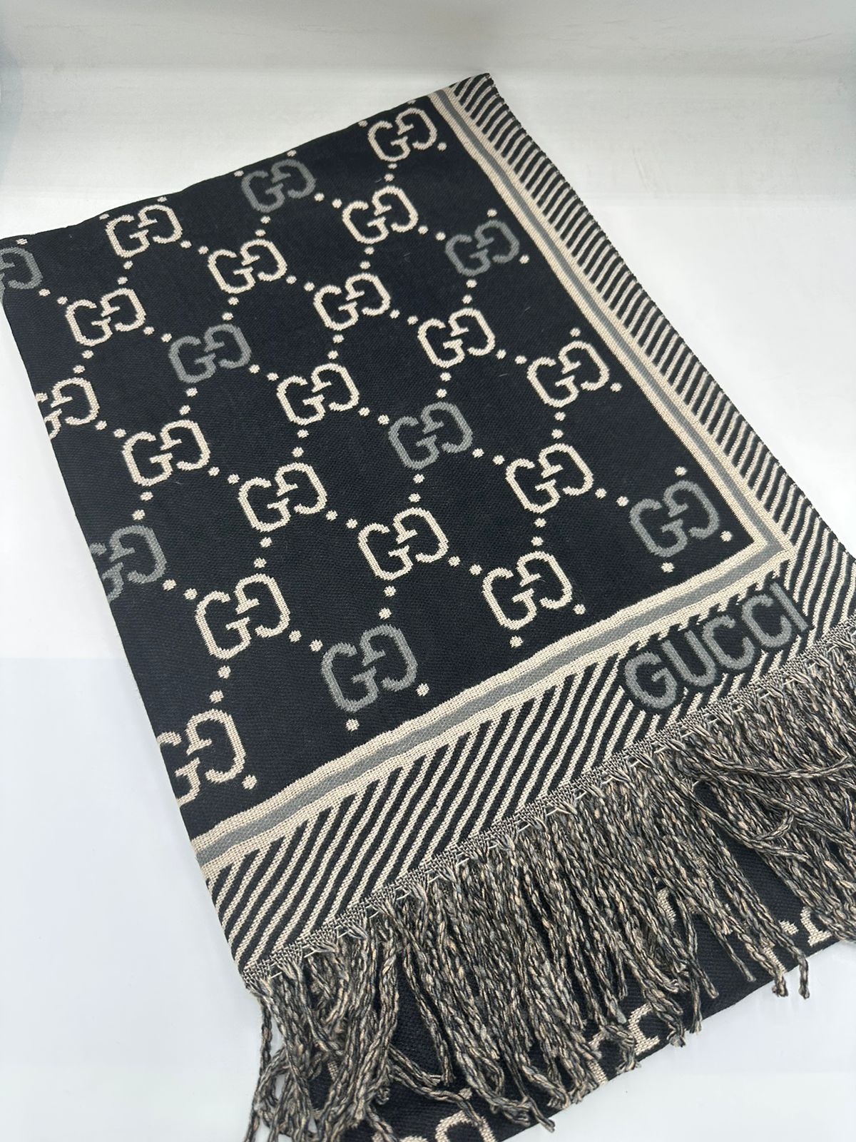 Black/Brown Background with repeating "G" logos and the word "GUCCI" along the edge. The scarf has a fringed edge and a striped border in shades of black, white, and grey. It is identified as a "Gucci Shawl super– euro style". Gucci scarves are often made in Italy from high-quality wools and cashmere.