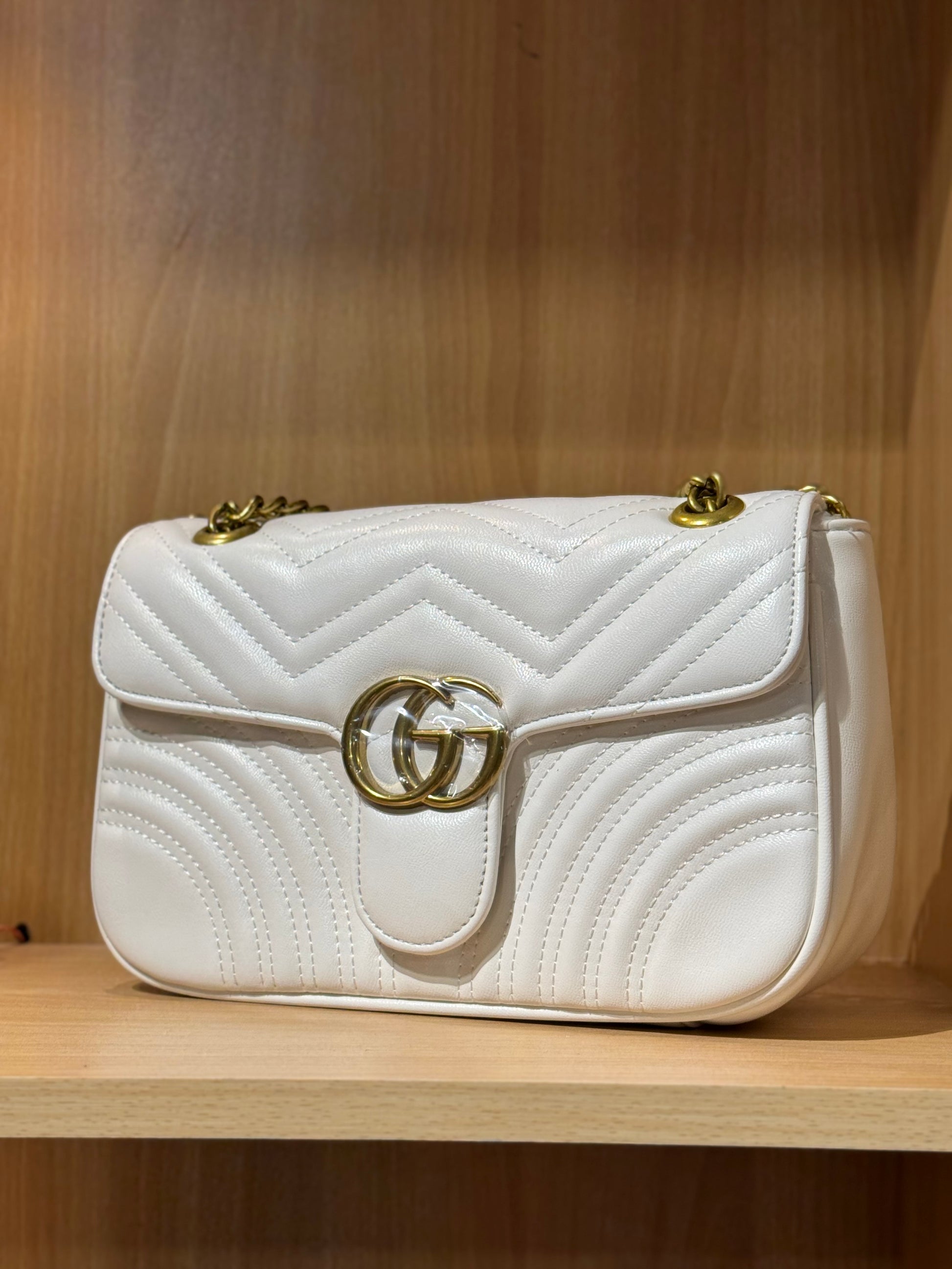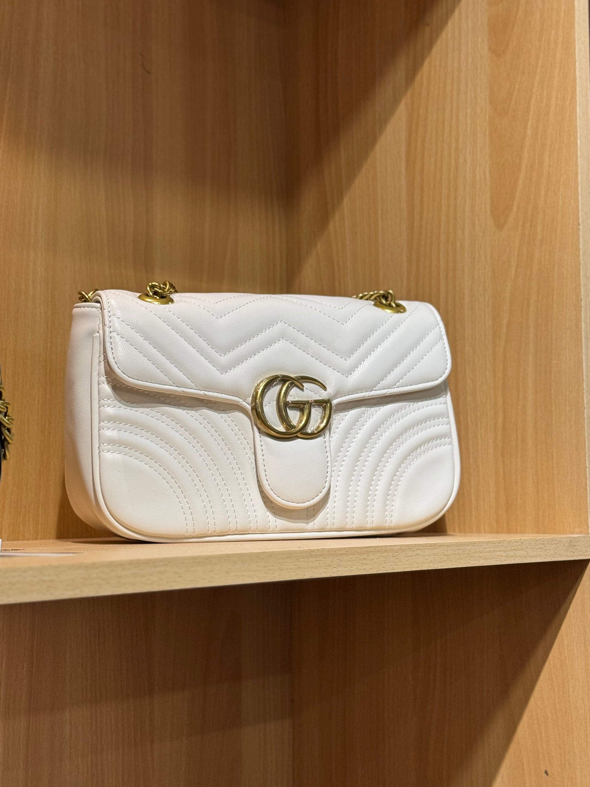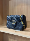 The small GG Marmont camera bag has a softly structured shape and a flap closure with Double G hardware. The sliding chain strap can be worn multiple ways, changing between a shoulder and a top handle bag. Made in matelassé chevron leather with a heart on the back.