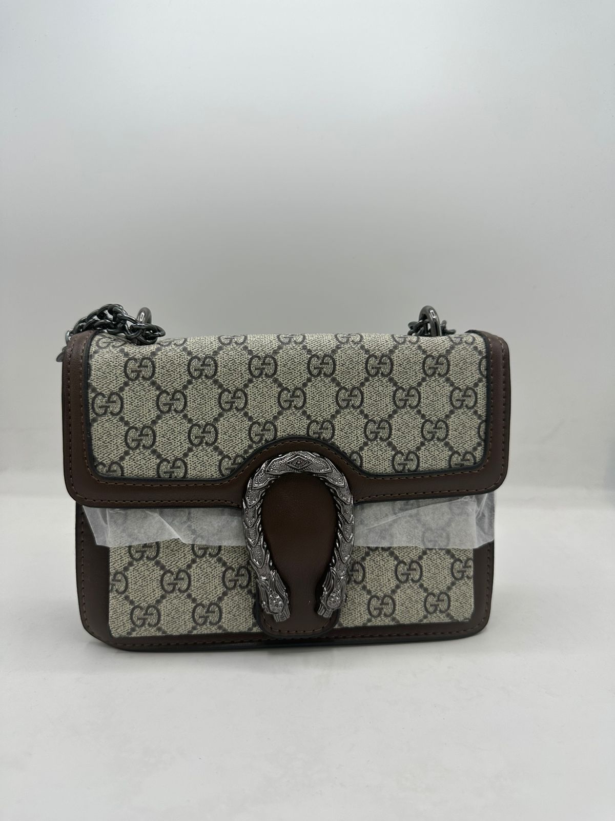 Gucci Dionysus bag. This iconic bag, introduced in the Fall/Winter 2015 collection, features the GG Supreme monogram canvas, a textured tiger head spur closure, and a chain shoulder strap. The tiger head detail pays homage to the Greek god Dionysus. Gucci handbags come in various sizes and styles, crafted from materials like leather, canvas, and suede, and often include zippered compartments and metal closures.