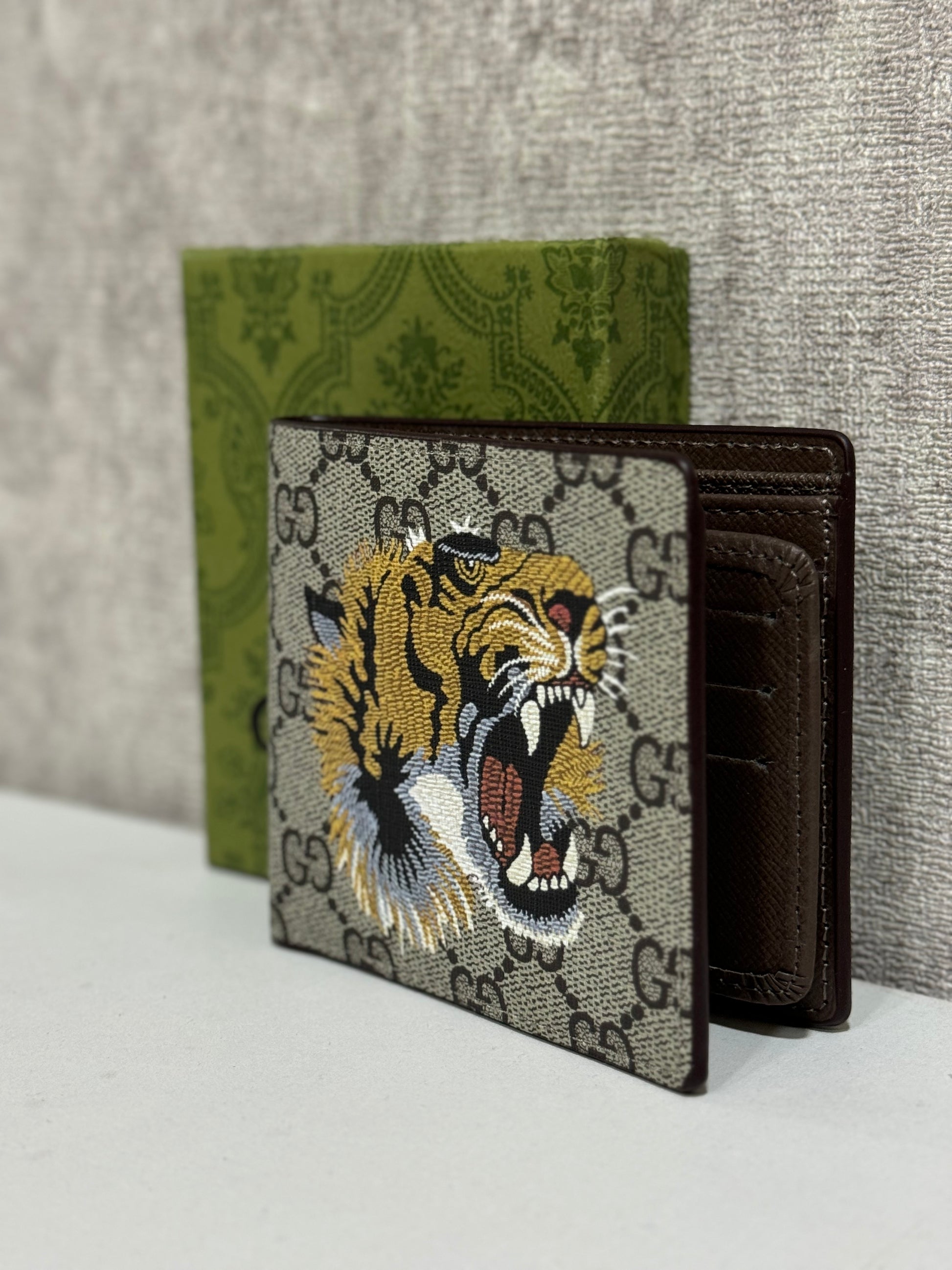 The GG Supreme pattern by Gucci is so popular that it's time you update your wardrobe with a piece from that range. This bifold wallet, for example, is simply stylish. It comes made from signature canvas with a tiger print. It has a leather & fabric interior with enough space for essentials.