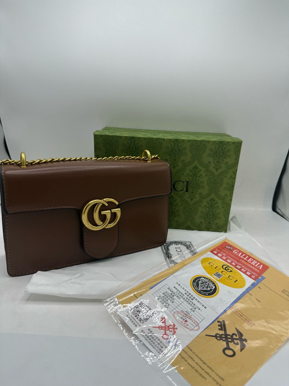 Gucci GG Marmont leather shoulder bag in brown with gold hardware, including the iconic double G logo. The bag is accompanied by its original packaging, including a green box, dust bag, and authenticity cards. The Gucci GG Marmont bag is characterized by its matelassé leather, structured shape, and the Double G hardware. The small size of the Gucci Marmont flap bag measures approximately 10 inches in width, 6 inches in height, and 3 inches in depth.