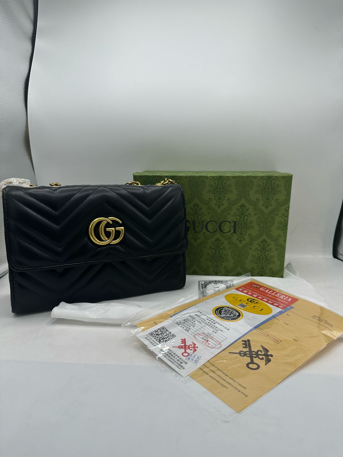 Gucci GG Marmont matelassé leather shoulder bag with antique gold-toned hardware, accompanied by its original box and paperwork. The GG Marmont line, recognized by its Double G hardware, is crafted from soft matelassé leather with a structured shape. This particular bag showcases the chevron pattern and the iconic Double G logo, which originated in the 1970s.