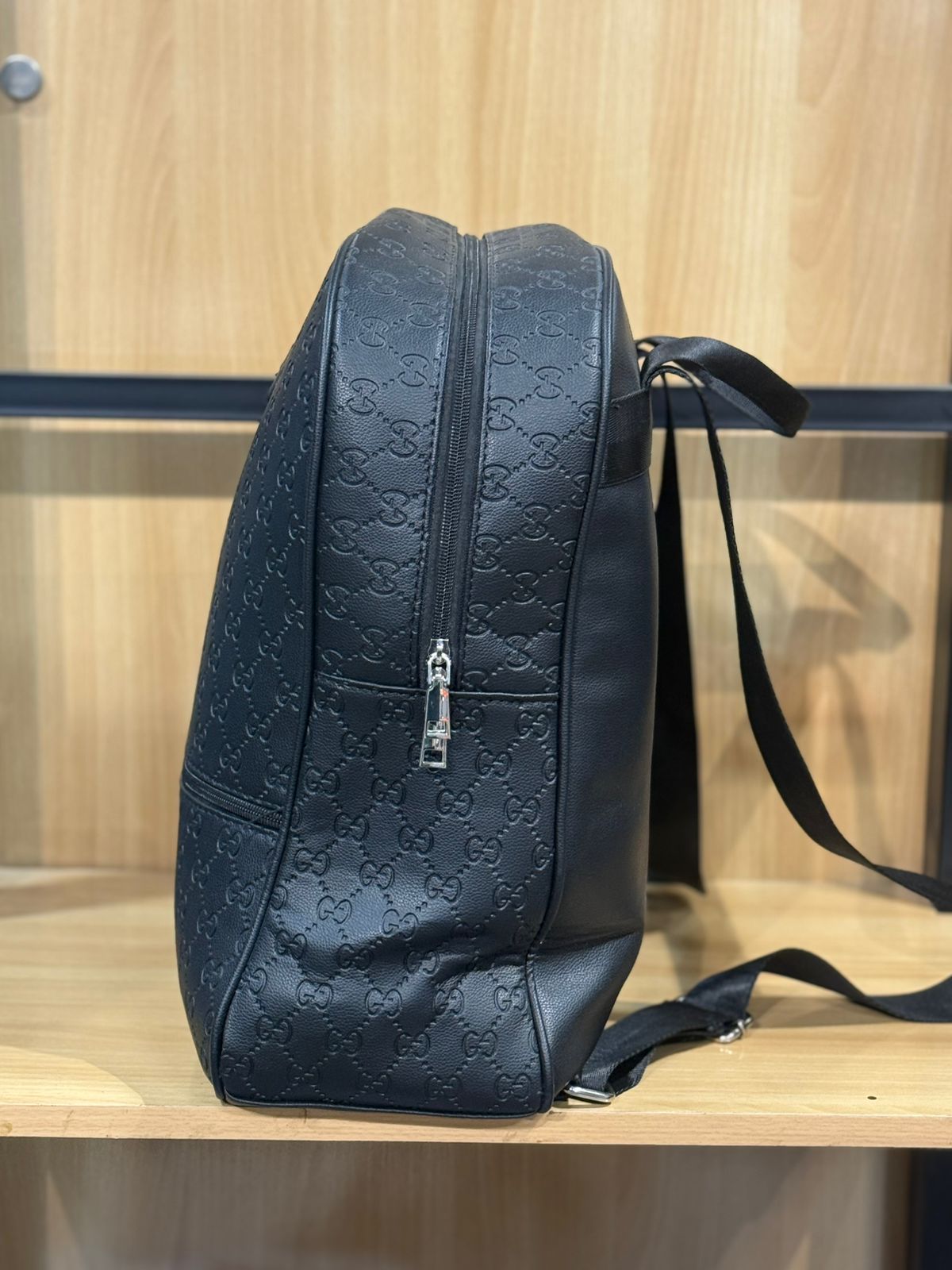 Hardware: Features silver-toned zippers and pulls, which provide a subtle contrast to the black leather and maintain the backpack's sleek appearance. The zipper pulls often have "GUCCI" engraved on them (visible on the main zipper pull in Image 2).