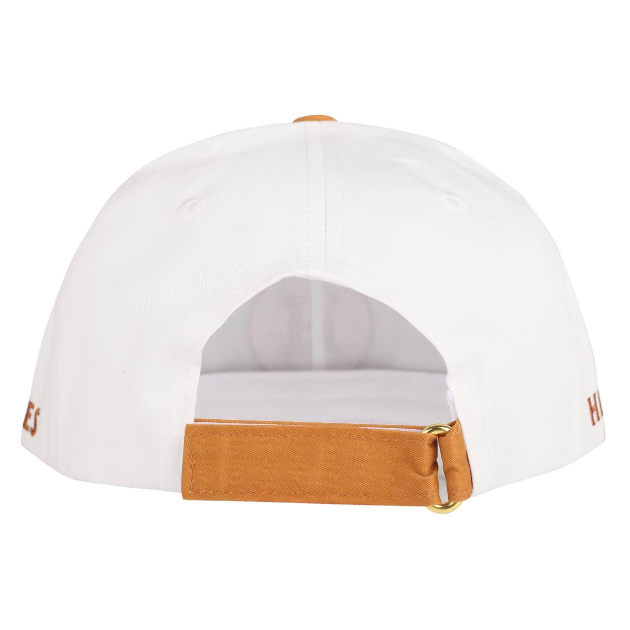 Cap in trench cotton gabardine with "H" motif in Swift calfskin topstitched on felt on the front, and adjustment tab with two polished palladium-plated Clou de Selle snap closures. Lining in cotton and plain silk.