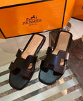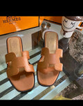 These are minimalist, flat slide sandals featuring a distinctive "H" shaped cut-out on the upper strap, which makes them instantly recognizable as a Hermès product.
