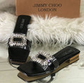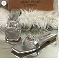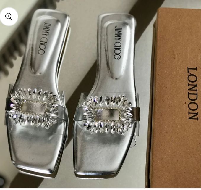 The sole of the slipper clearly shows "JIMMY CHOO," and a shoebox in the background indicates "JIMMY CHOO LONDON