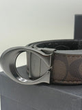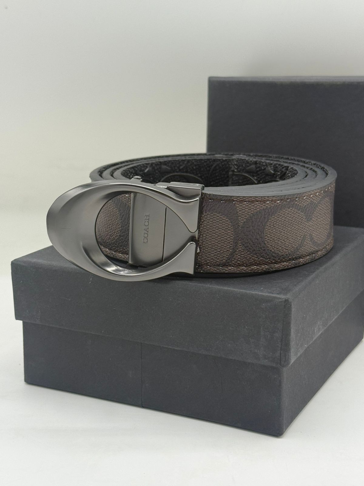 Buckle: Each belt is fitted with a large, distinctive "C" shaped buckle. The buckle has a sleek, slightly curved design and appears to be made of a darkened metal, likely gunmetal or a matte black finish, giving it a modern and understated luxury look. The word "COACH" is subtly engraved on the side of the buckle.