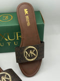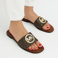 MK Hayworth slide sandals, Brown Colour featuring a brown monogram print strap with a gold-tone MK logo embellishment. These casual slip-on sandals have a flat, brown sole and are designed for women. Michael Kors is a well-known designer of luxury accessories and ready-to-wear, with a brand aesthetic that combines stylish elegance and a sporty attitude.