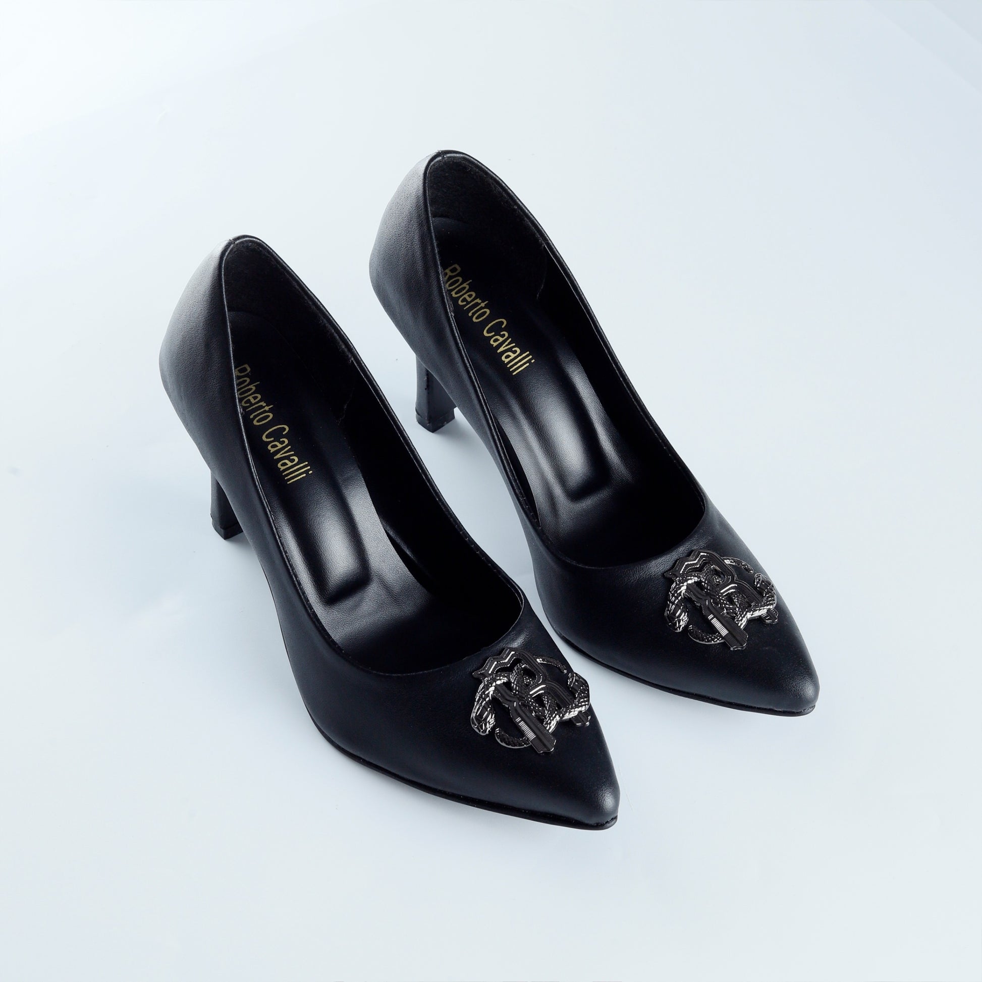 Embellishment: A prominent metallic ornament, possibly featuring an animal or abstract design, is affixed to the toe of each shoe, characteristic of Roberto Cavalli's designs known for their bold elements like animal prints and distinctive hardware.