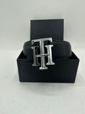 Tommy Hilfiger black leather belt featuring a Silver-toned "TH" logo buckle, presented in a black Tommy Hilfiger box. It is made of 100% leather, 3.5 cm wide, with a square pin buckle for size adjustment. The belt's design is described as simple and iconic, suitable for both casual and formal occasions, such as work or weddings. Tommy Hilfiger, founded in 1985, is known for its classic American style with a modern twist.