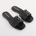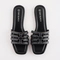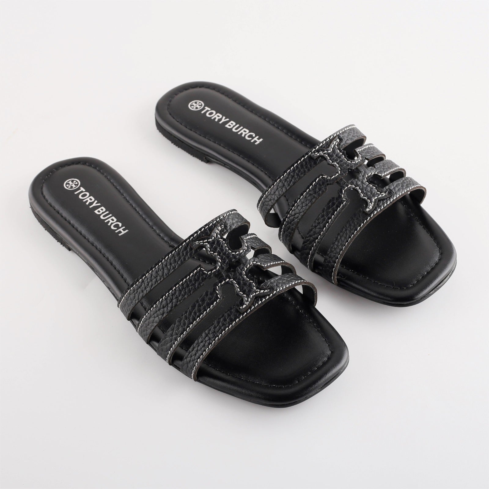 A minimalist silhouette distinguished by an intricate laser-cut logo that blends into the negative space of straps. The contrast of finely-stitched tumbled leather against a smooth, cushioned footbed. Crafted in partnership with a Leather Working Group-certified tannery, supporting high standards in leather manufacturing and chemical management.Read less