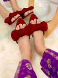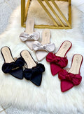 Design: A pointed-toe flat slipper style with a large, decorative bow made of satin-like material on the upper part of the shoe.