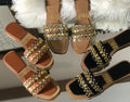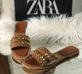 The design is noted to be inspired by brands like Zara, combining trendy aesthetics with a timeless flat sandal silhouette.