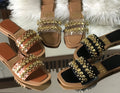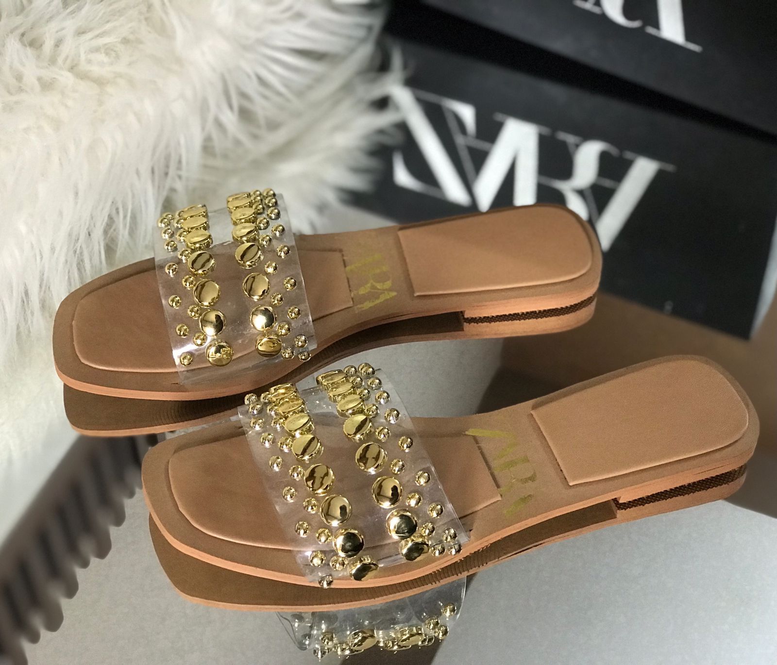 Flat sole with a wide strap across the foot, adorned with gold-toned studs.